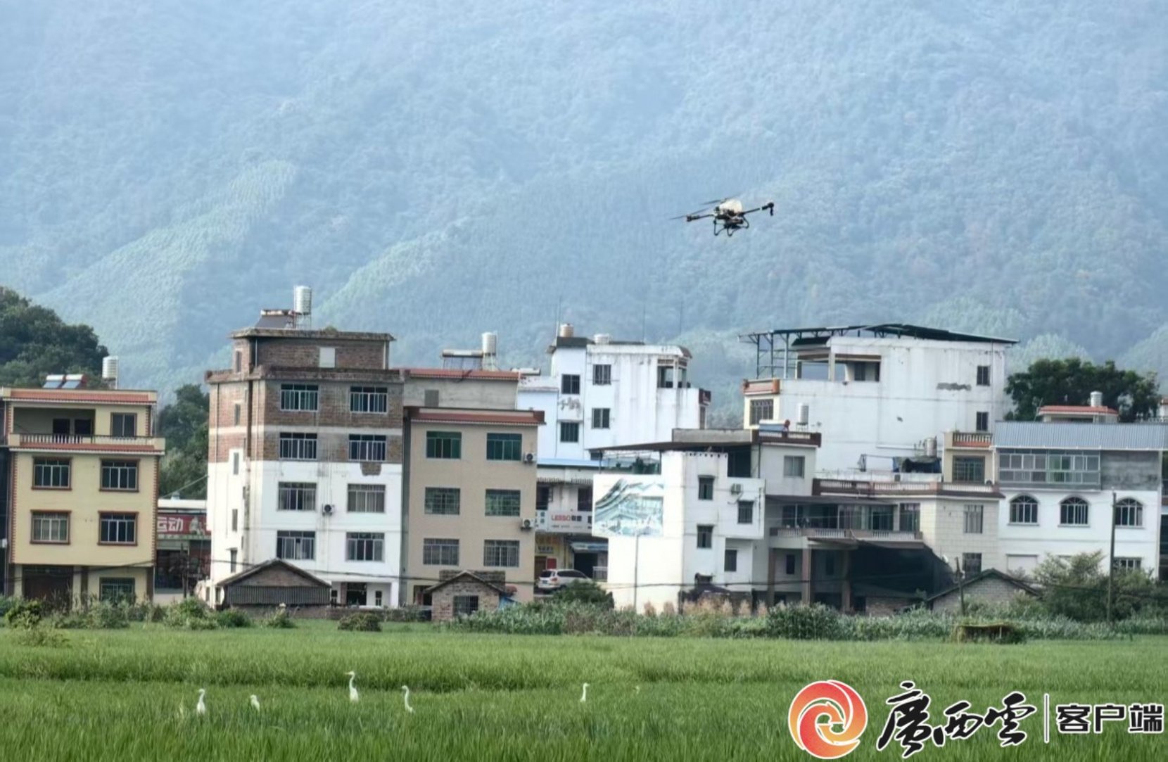 农业无人机在农田上空穿梭。贺州市厚园生态农业科技有限公司供图