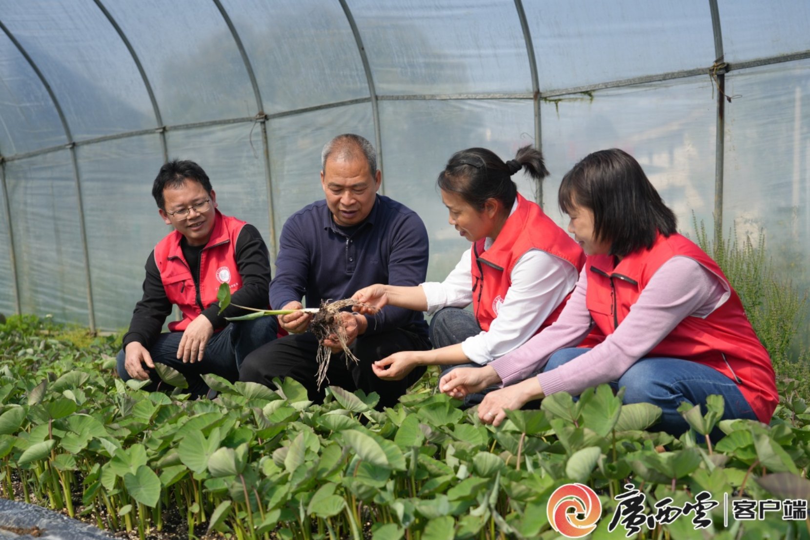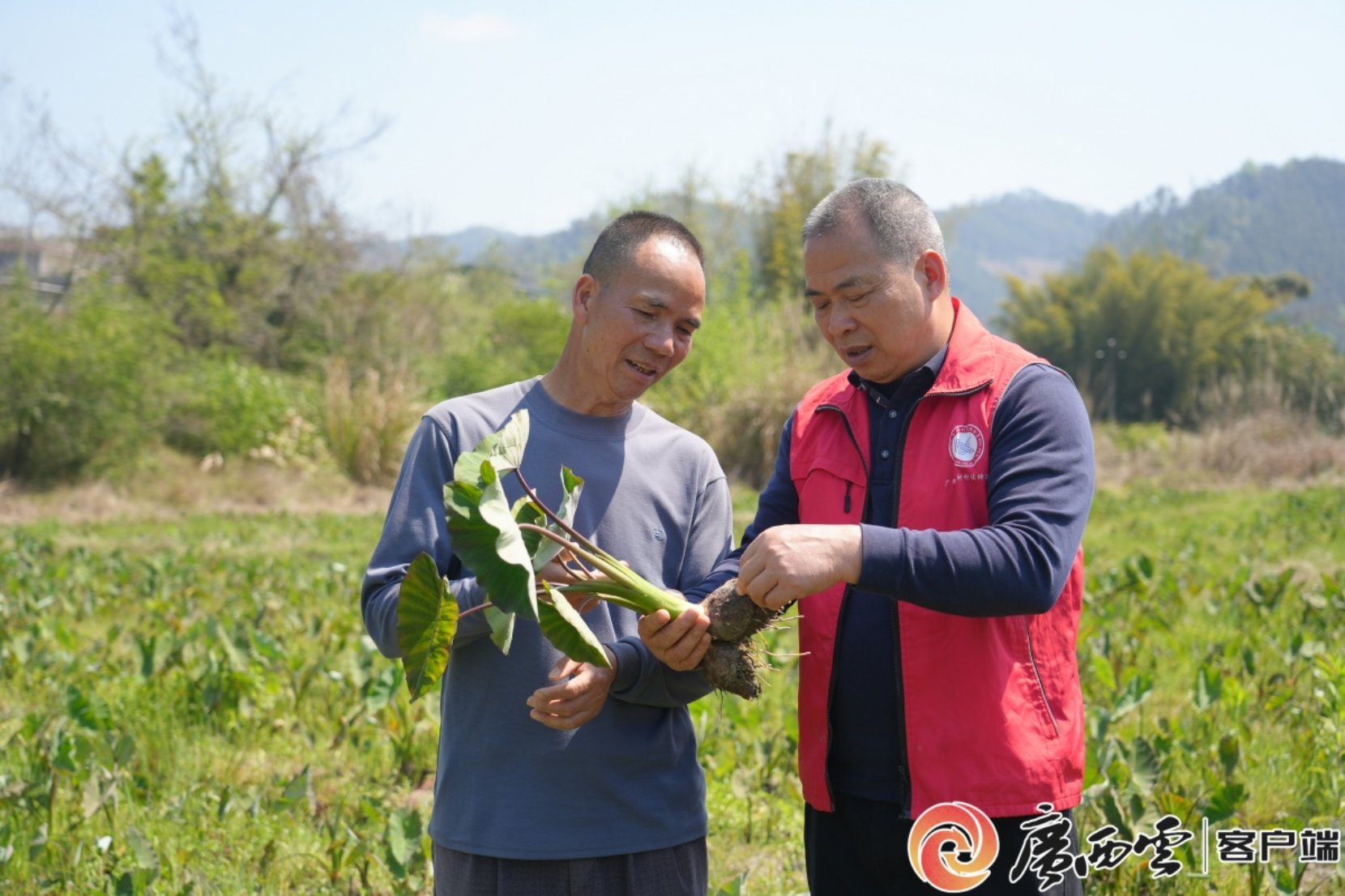 图为科技特派员们在交流香芋种苗种植经验。谭小荣 摄