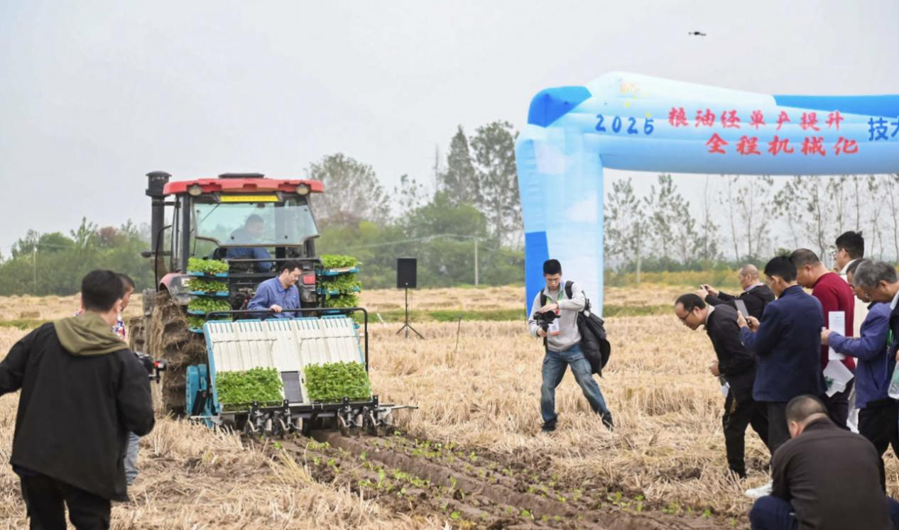 近年来,中央和农业农村部实施粮食单产提升工程,集成推广良田、良种、良机、良法全面提升单产水平。利用农业机械、采用社会化服务方式,是推进农业提单产的重要途径。本次展会期间,总站在湖北省武汉市汉南区隆重举办了以“先进适用农机装备推动三秋粮油经生产能力提升”为主题的2025粮油经单产提升全程机械化技术装备演示活动。此次活动吸引了31家农机生产企业的70多台套机具参加作业演示,其中5家企业的油菜毯状苗移栽机开展了作业验证大比武。中国工程院院士陈学庚教授莅临指导。来自全国各地农业农机主管部门代表、展会观众和 “一带一路”国际友人300多人参加了活动。演示活动聚焦长江流域稻油、稻菜、稻烟轮作全程机械化智能化生产,将展会上的机具应用于田间作业,通过主持人介绍和专家讲解,集中展示了水稻收获、秸秆处理、稻田耕整、油菜种植、蔬菜种收、烟草种收等环节先进适用机械化技术装备、生产模式和解决方案,有力地推进了农机装备补短板、新型机具研产推用和农机化高质量发展。