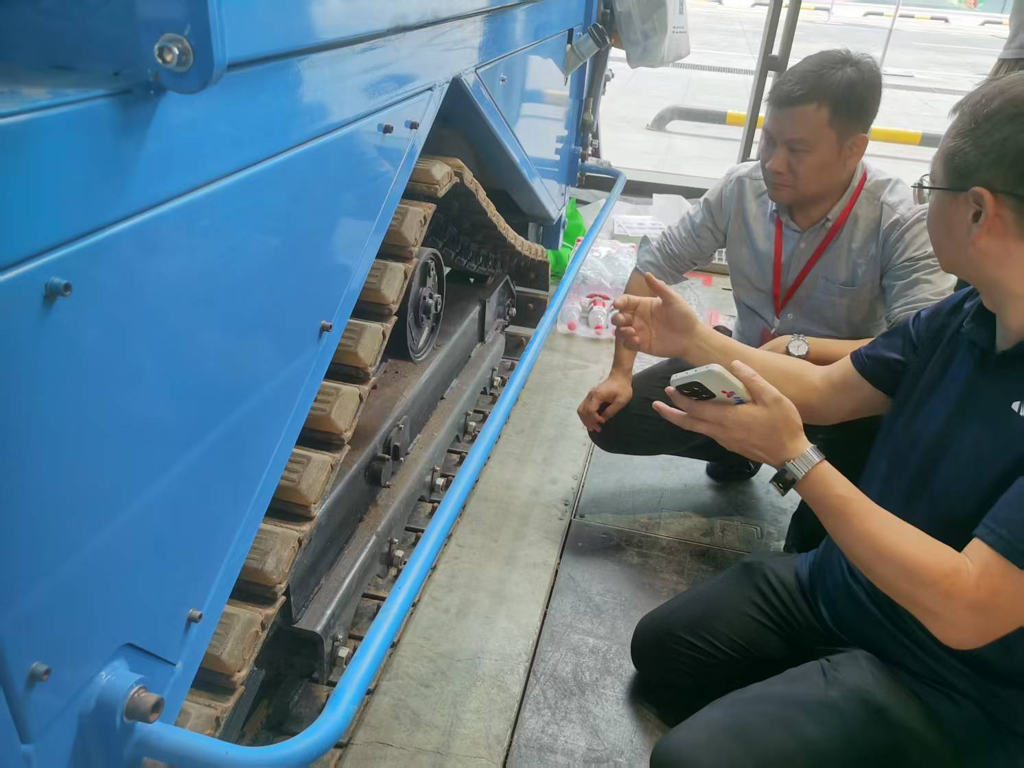 农机化总站技术专家现场向生产厂了解切段式无人驾驶甘蔗联合收获机