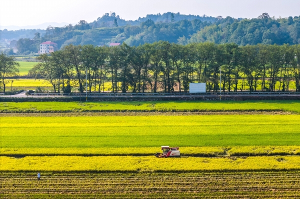 10月11日,湖南省双峰县井字镇生机村,农民驾驶收割机收获晚稻。金秋时节,该县涓水河畔万亩粮食生产示范区的晚稻迎来收获季,当地农民抢抓农时开展晚稻收割工作。