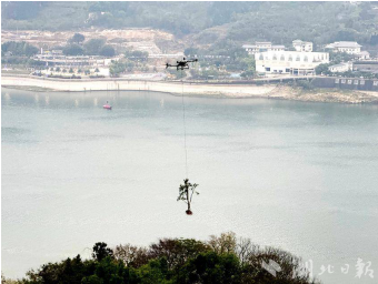 4月8日,在湖北省恩施州巴东县官渡口镇五里堆社区二组的山坡果园里,一架大型无人机腾空而起,用绳索稳稳吊起带着土球的柑橘苗,穿梭在山林间,将苗木精准运送到移栽地块。不到3个小时,130余棵柑橘树就完成了“空中转运”,高效便捷的作业方式,让果农们连连称赞。