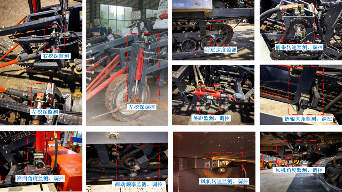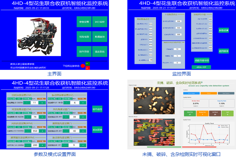 针对上述产业需求,南京农机化所绿色耕作与根果类作物收获技术装备创新团队依托“十四五”国家重点研发计划、中国农业科学院创新工程、国家花生产业技术体系等项目任务,开展了高效花生联合收获全环节“信息感知、智能决策、变量调节、自动控制、协同作业”等关键核心技术攻关,取得了多项突破性进展。创制了垄面仿形限深挖掘、割台横向变轨自动对垄、辊筒浮动变频柔性摘果、风筛选自适应调控等自主变量作业执行机构,实现了收获参数全液驱适时精准变量调节;开发了作业质量、作业状态信息智能监测系统,实现了未摘、含杂、破碎等作业质量在线检测、以及执行部件位移类、角度类、速度类、力学类等作业参数在线监测;构建了收获质量预判模型、作业部件调控策略、作业参数决策模型,融合喂入量、作业质量指标等实时特征信息,开发了基于机电液融合、多源异构信息融合的参数智能调控系统,实现了全环节自主变量作业的闭环控制;集成创制全环节自主变量收获智能控制系统,并成功应用于两垄四行花生联合收获机。