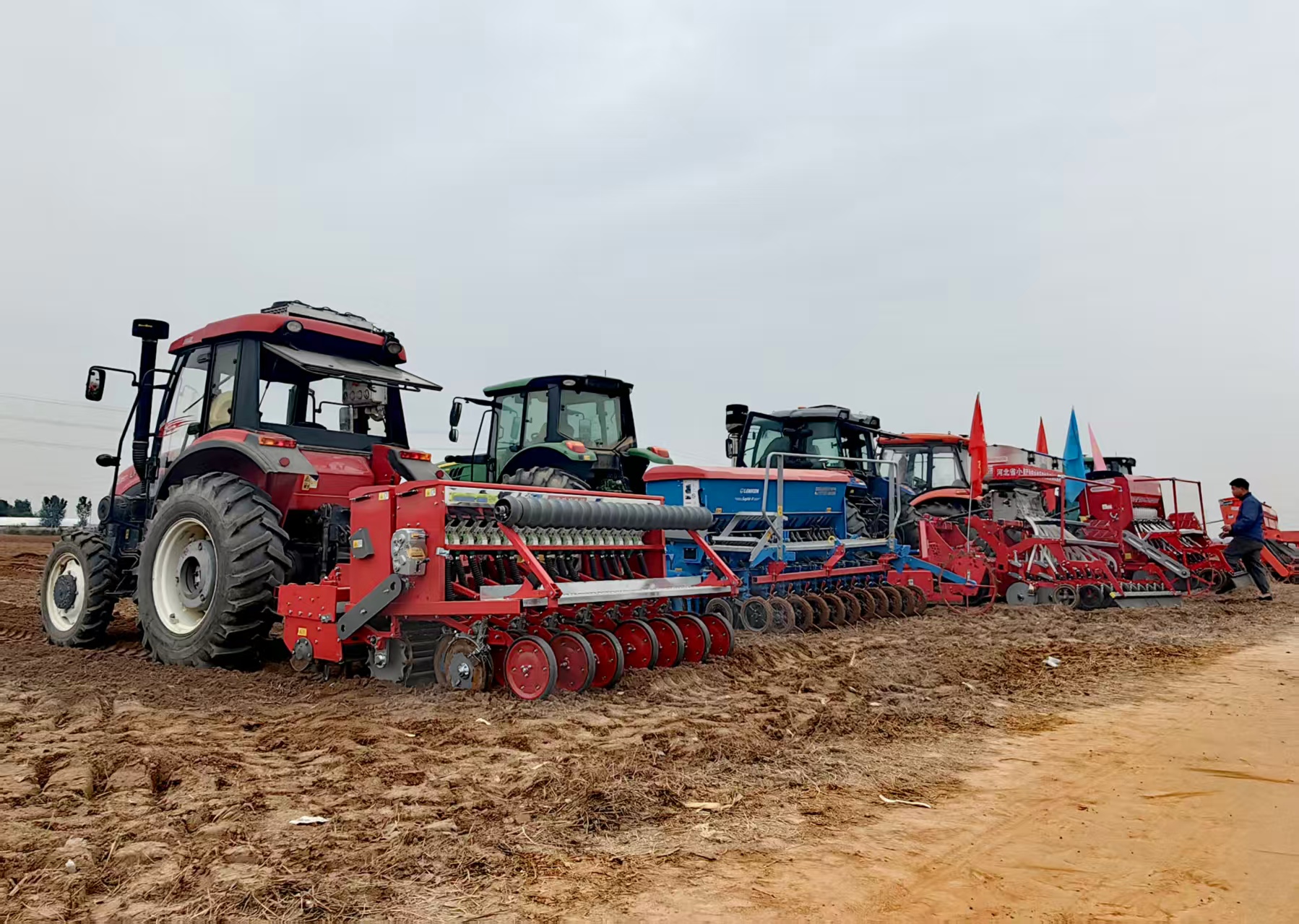 来到田间,四台参试播种机经过机手的细致检查和调整,做好了充足准备,整装待发。