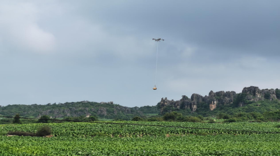 3WWDZ-U70A型农业无人机,吊运载重65kg,支持极速快充,落地即飞,动力系统全面优化,作业成本更低,含高精度定位模块,最高飞行速度可达13.8米/秒。加装稳定器有效保证了农业无人机吊运过程中的稳定性。农业无人机的应用有效解决了丘陵山区烟叶运输问题,提高了运输效率。
